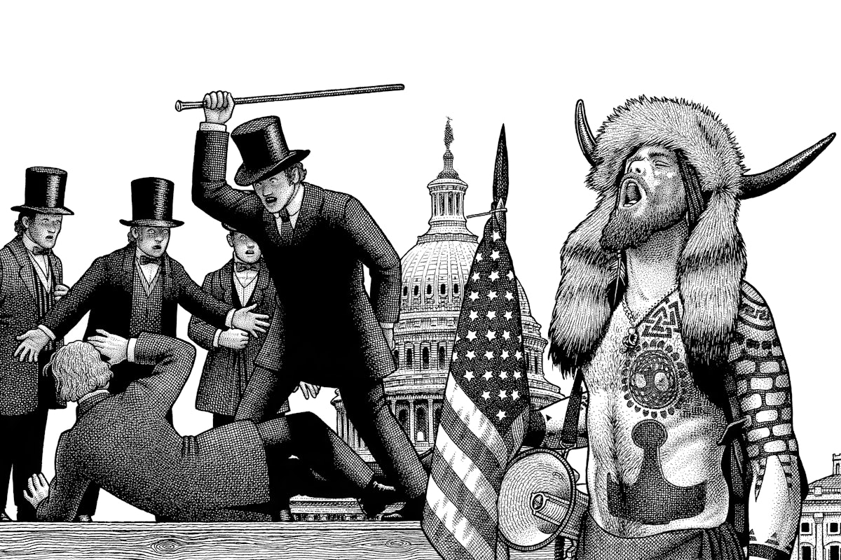 The atmosphere of illiberal violence even “suffused the halls of legislative power.” Even though Ohio and Illinois outlawed slavery in 1802 and 1848, “Black Laws” curtailed the ability of freed Black men to vote and otherwise participate in civic life. And, building on the work of the historian Joanne Freeman, Hahn recounts how physical altercations became a regular part of democratic and legislative politics at the state and local level. The speaker of the Arkansas House stabbed a colleague to death following a verbal insult in 1837. In 1838, a Maryland congressman named William Graves killed Maine Representative Jonathan Cilley in a rifle duel near the Anacostia bridge in Washington, following accusations of bribery. And, most famously, in 1856 South Carolina’s Preston Brooks pummeled Massachusetts’s Charles Sumner into a bloody pulp on the floor of the United States Senate chamber.